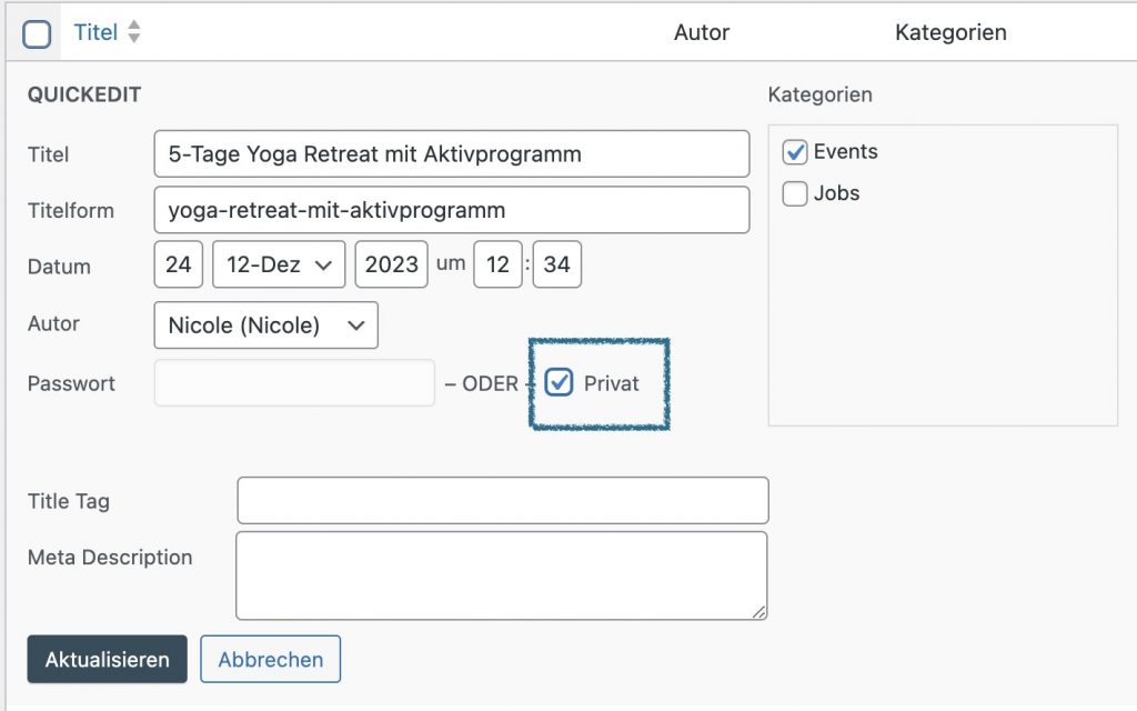 Wähle „Privat“ aus, wenn du das Event deaktivieren möchtest. Möchtest du es aktivieren, dann lass das Feld „Privat“ frei, um das Event freizuschalten. Klicke danach auf „Aktualisieren“, um deine Änderungen zu speichern.