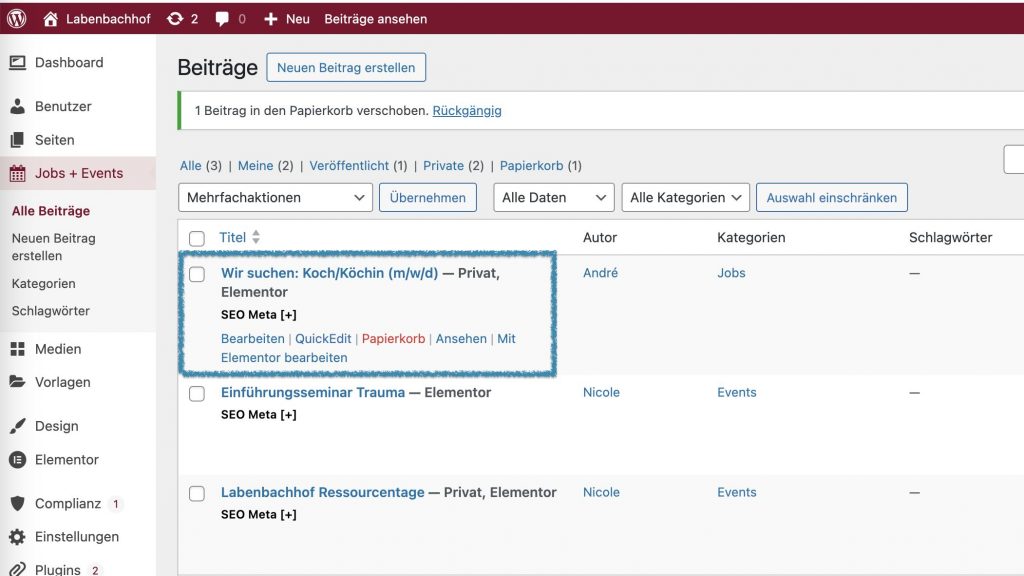 Melde dich unter labenbachhof.de/wp-admin an und gehe zur Seite Jobs + Events.