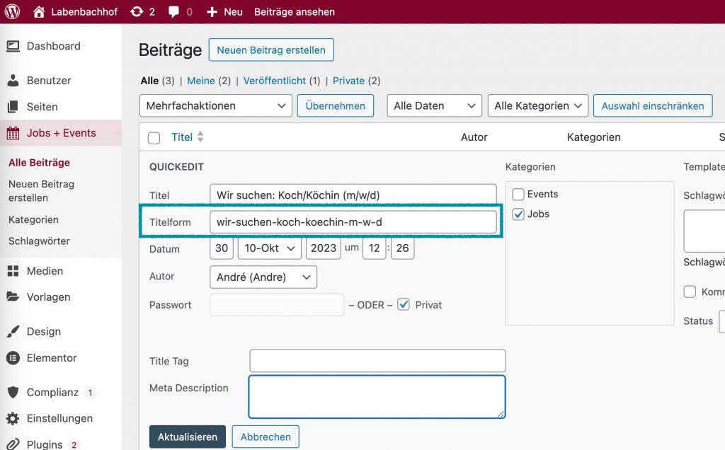 Klicke auf „QuickEdit“ und ändere die URL im Feld mit der Bezeichnung „Titelform“. Hier trägst du nur den Teil der Internetadresse ein, der nach dem Schrägstrich von labenbachhof.de/ folgen soll. Am besten verwendest du kleine Buchstaben und trennst Wörter mit Bindestrichen.